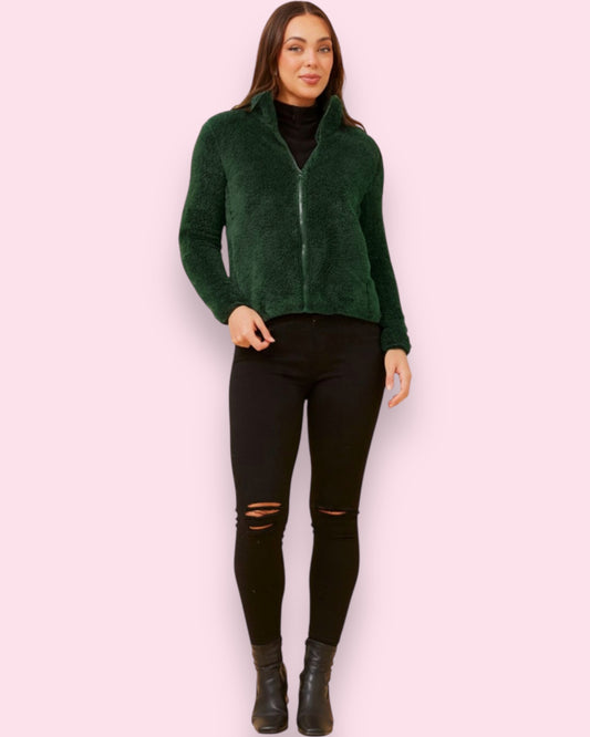Teddy Fur Zip Jacket - Forest Green