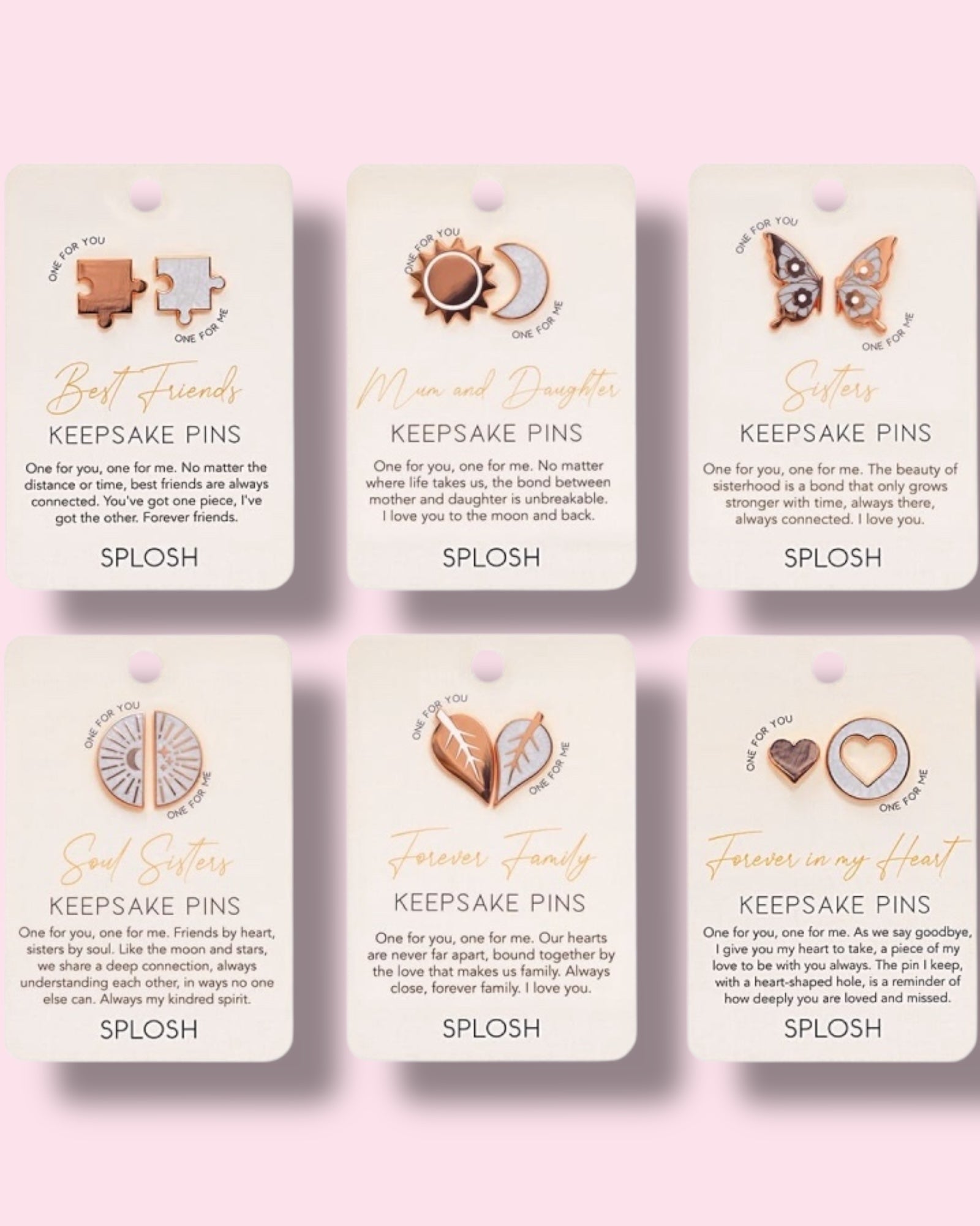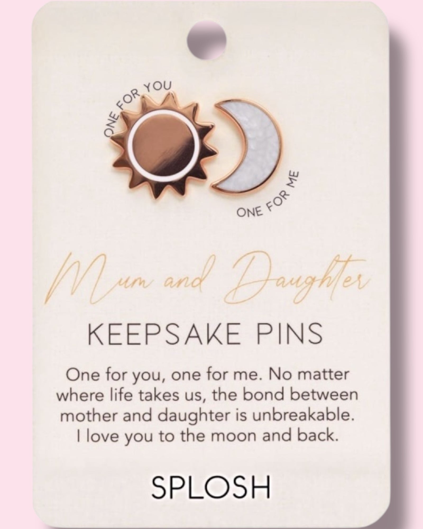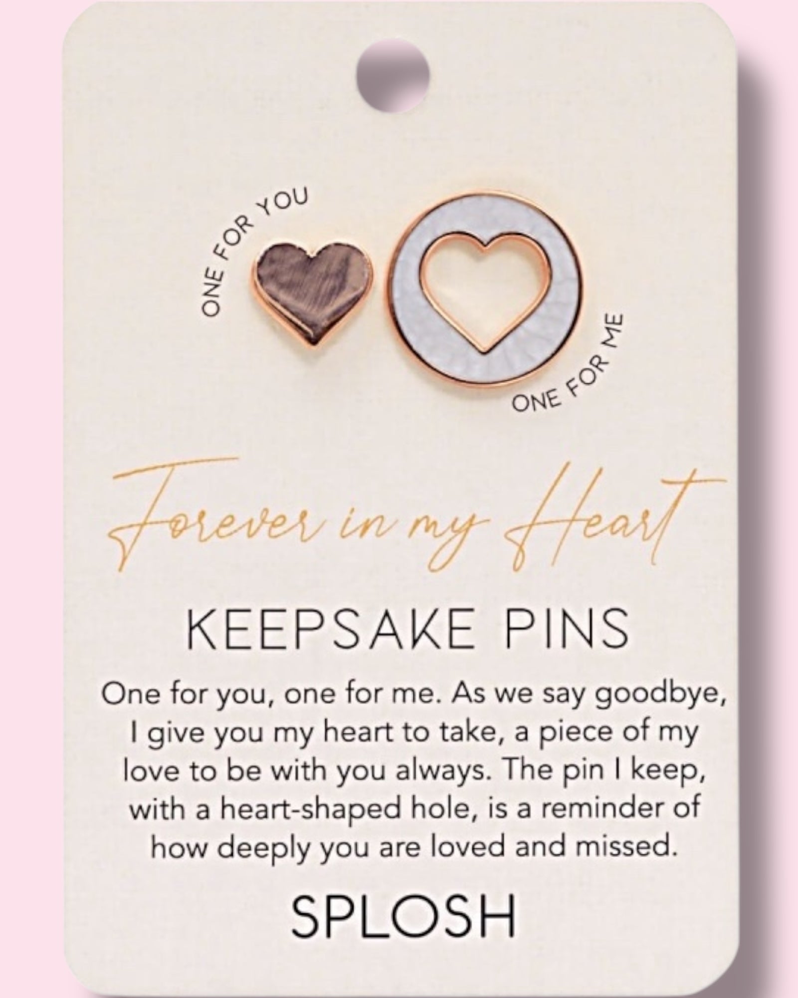 - Details: A pair of rose gold and enamel keepsake pins on a printed backing card, featuring a meaningful quote.