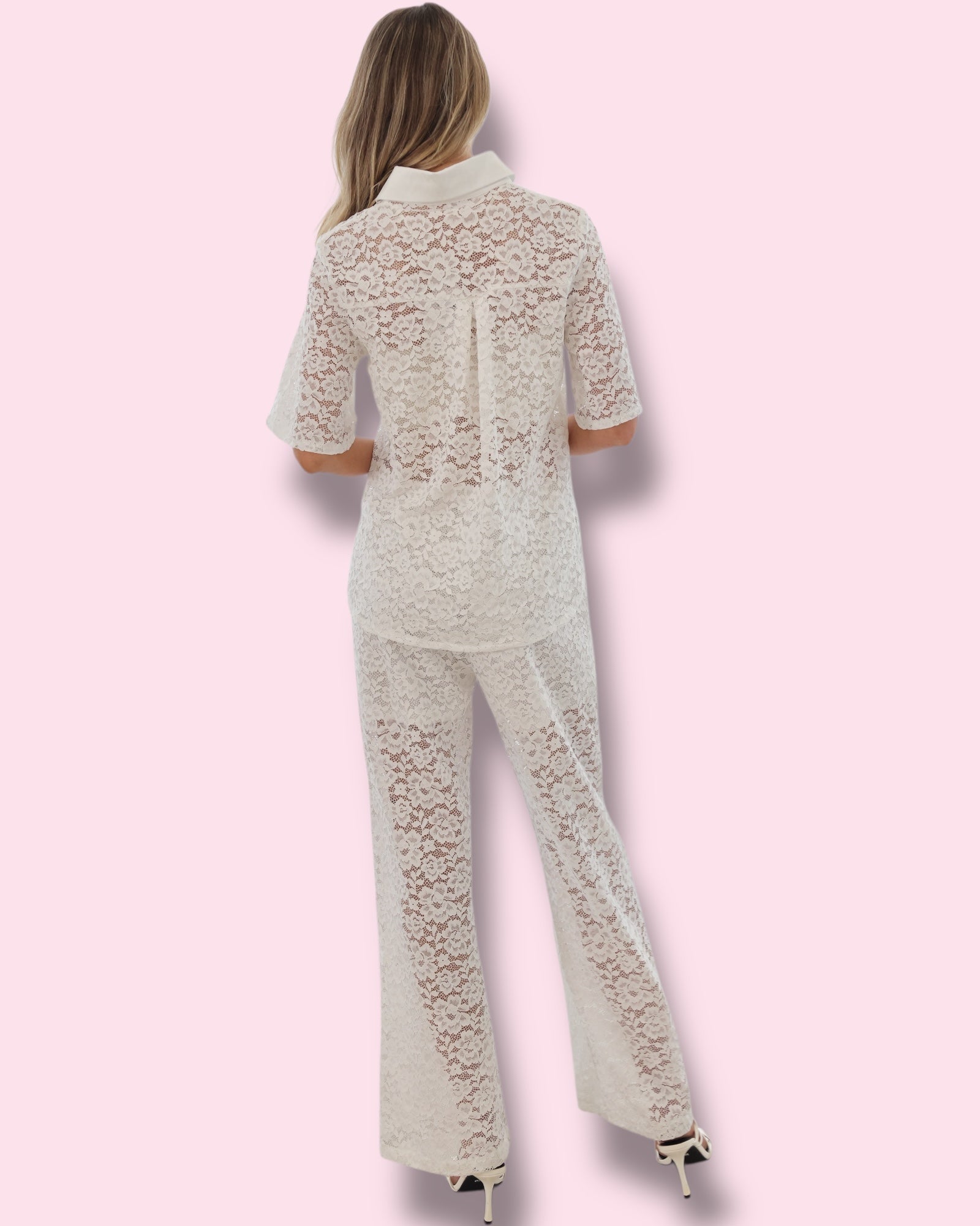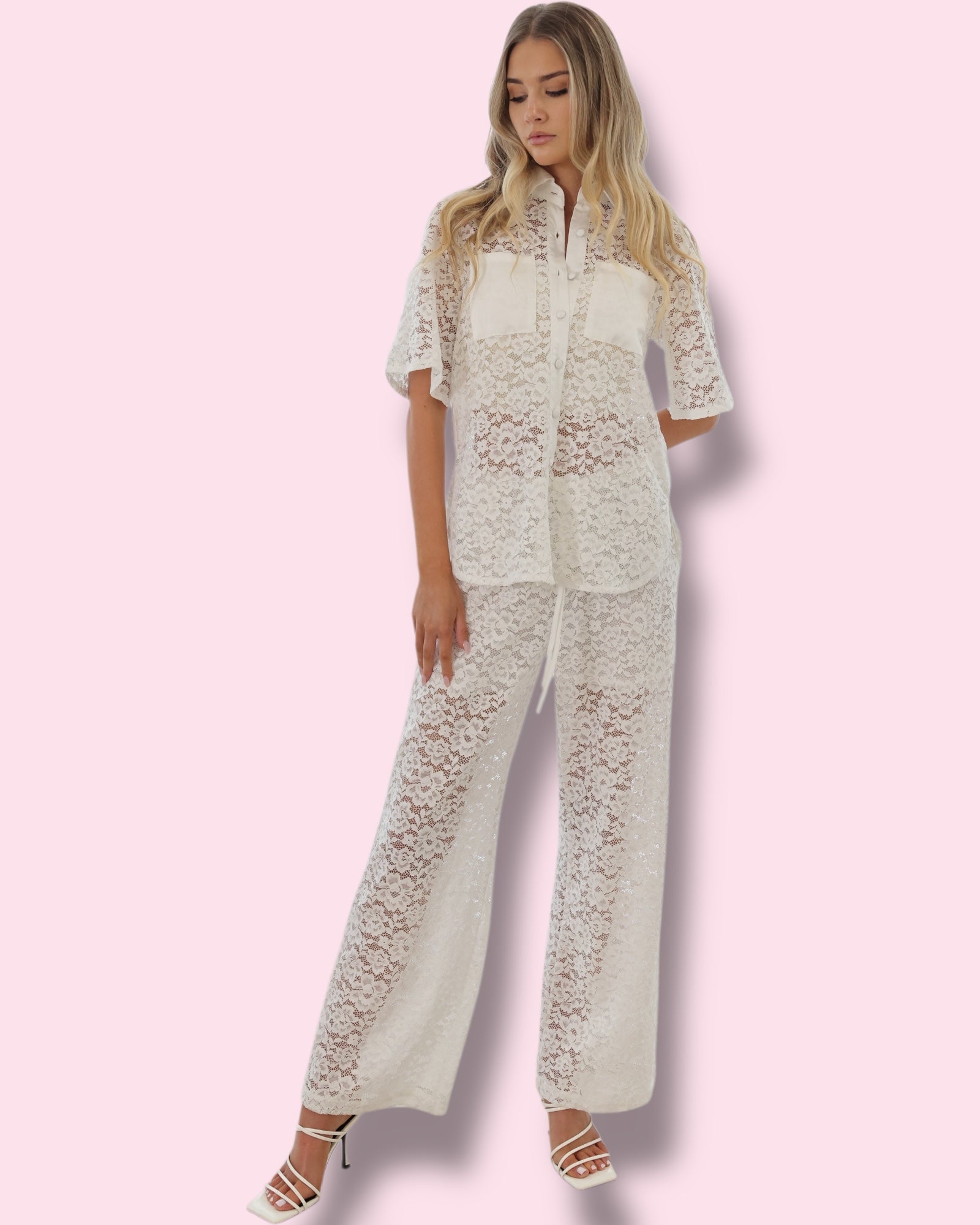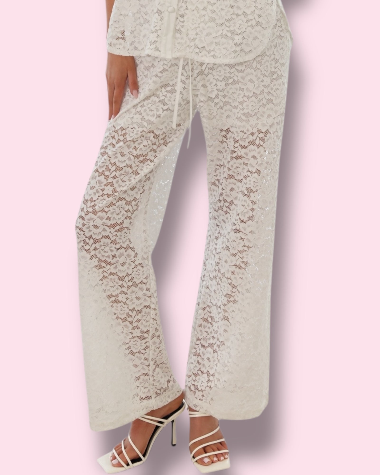 Step out in style with the Leyna Lace Pants, playfully chic and effortlessly classic. Crafted from woven floral polyester lace, these wide-leg pants offer a relaxed fit with a comfy elasticised drawstring waist.