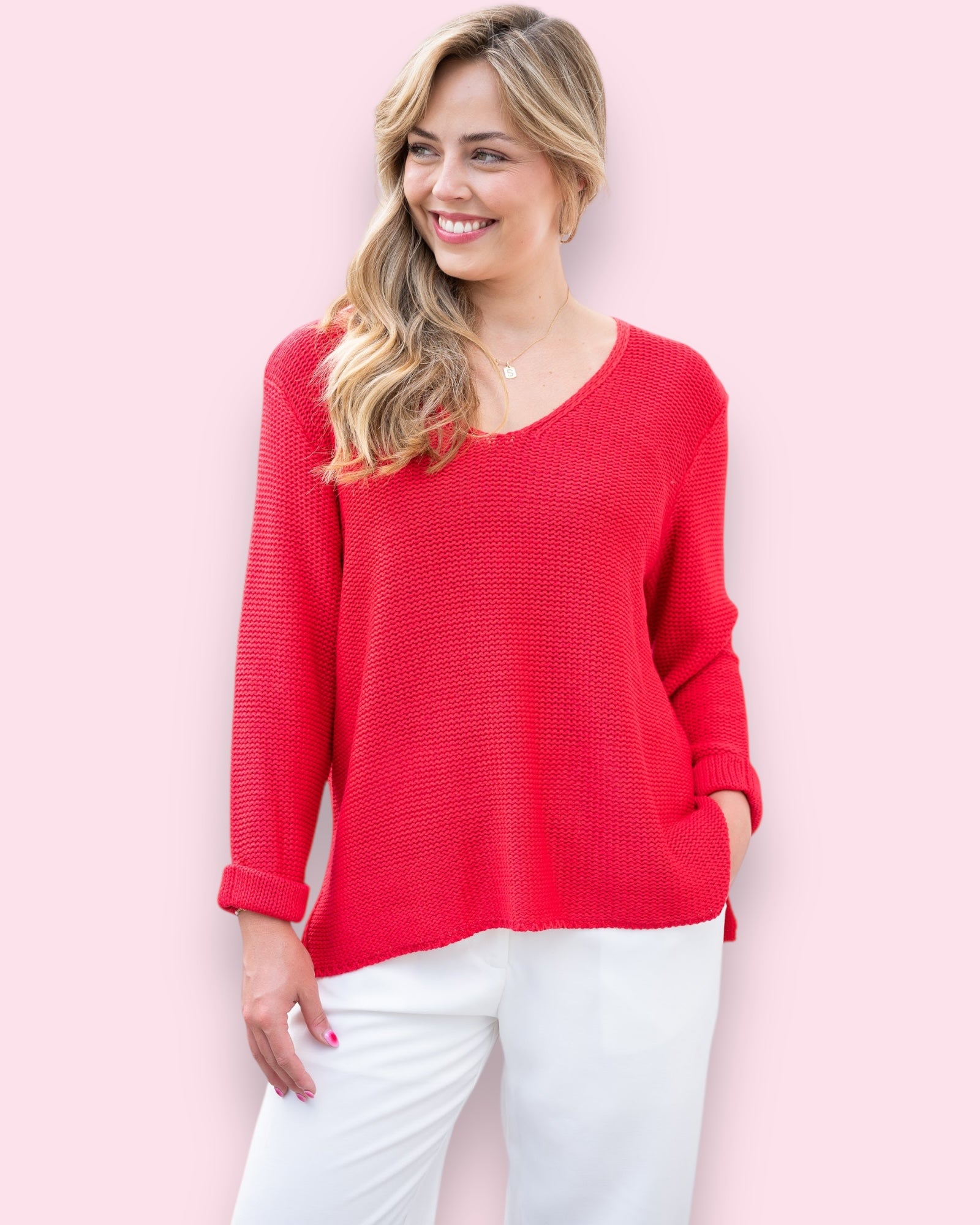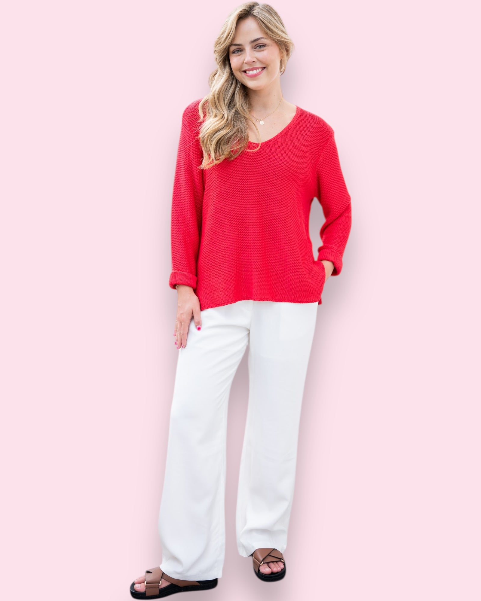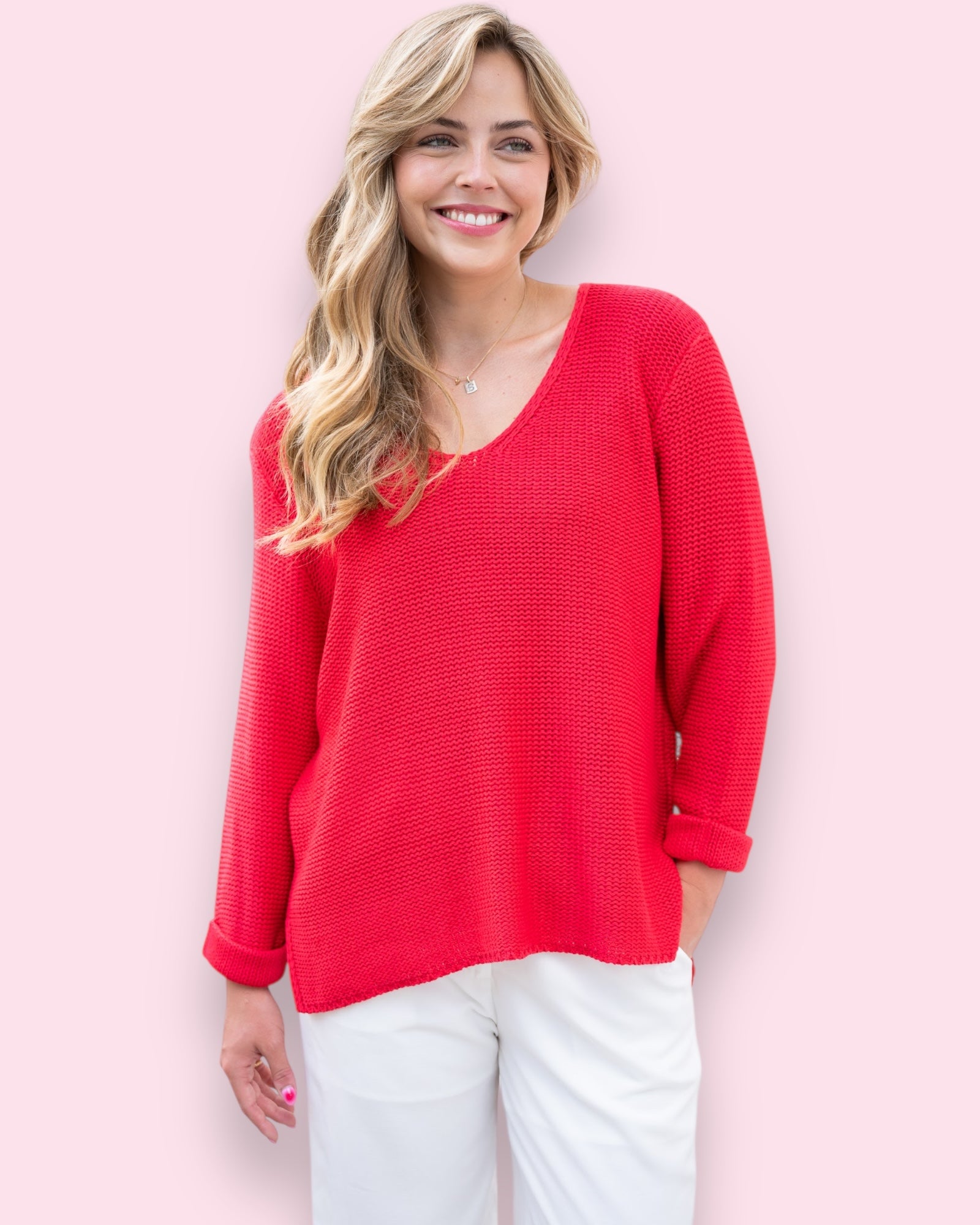 Wrap yourself in cozy style with the Maddie Knit! This best seller relaxed-fit sweater features a playful V-neckline and long sleeves with cuffed roll-up details.
