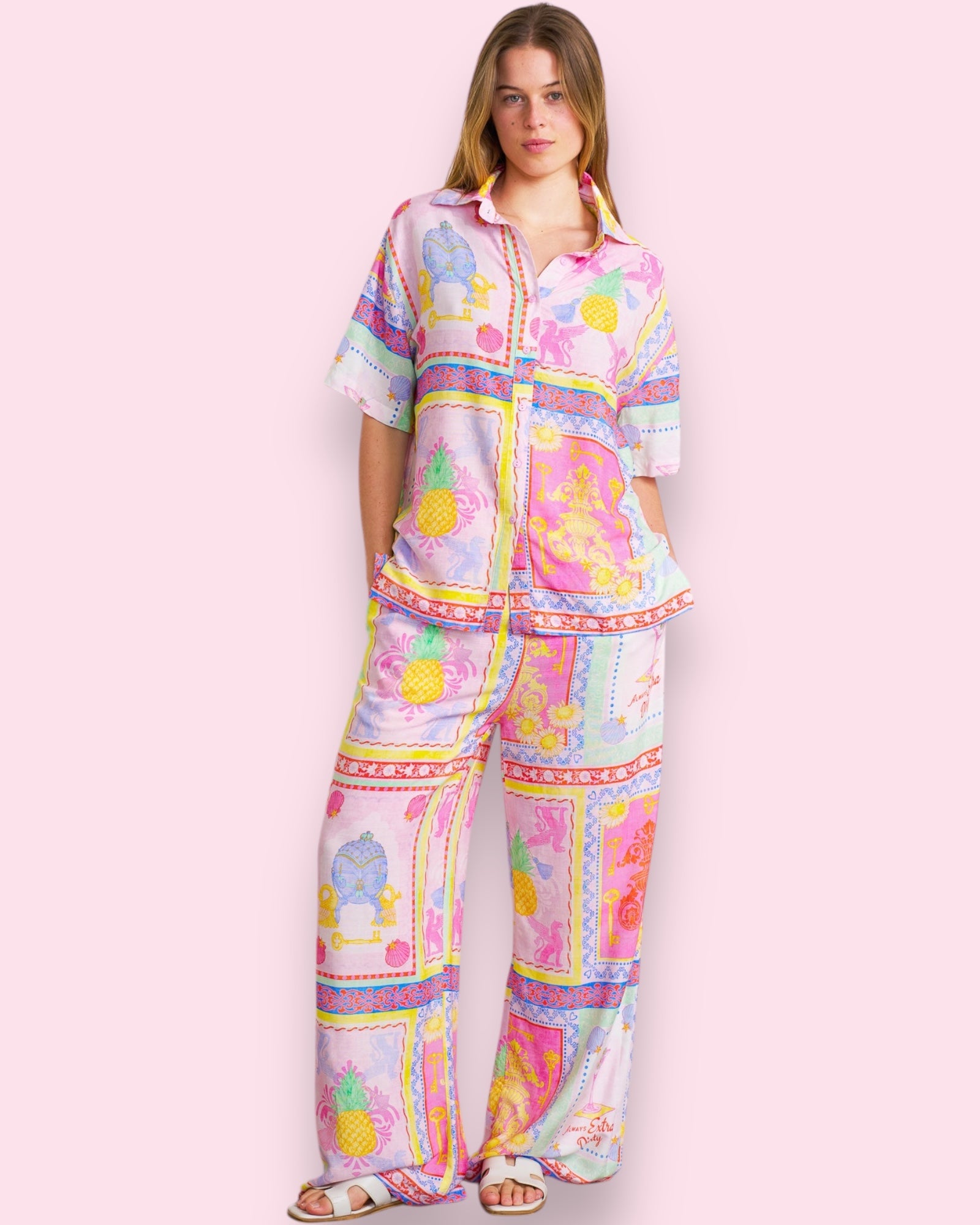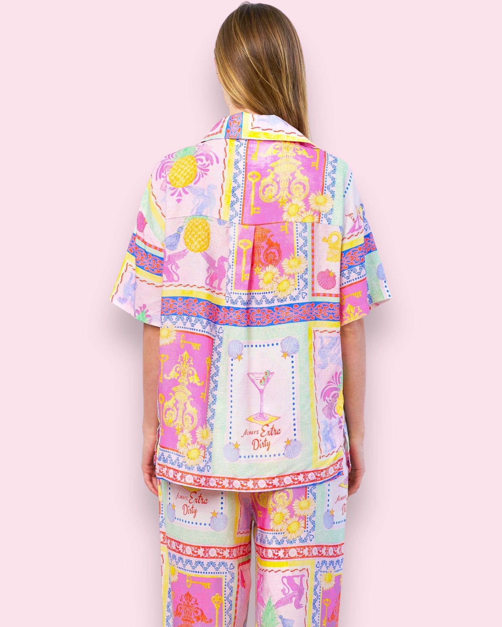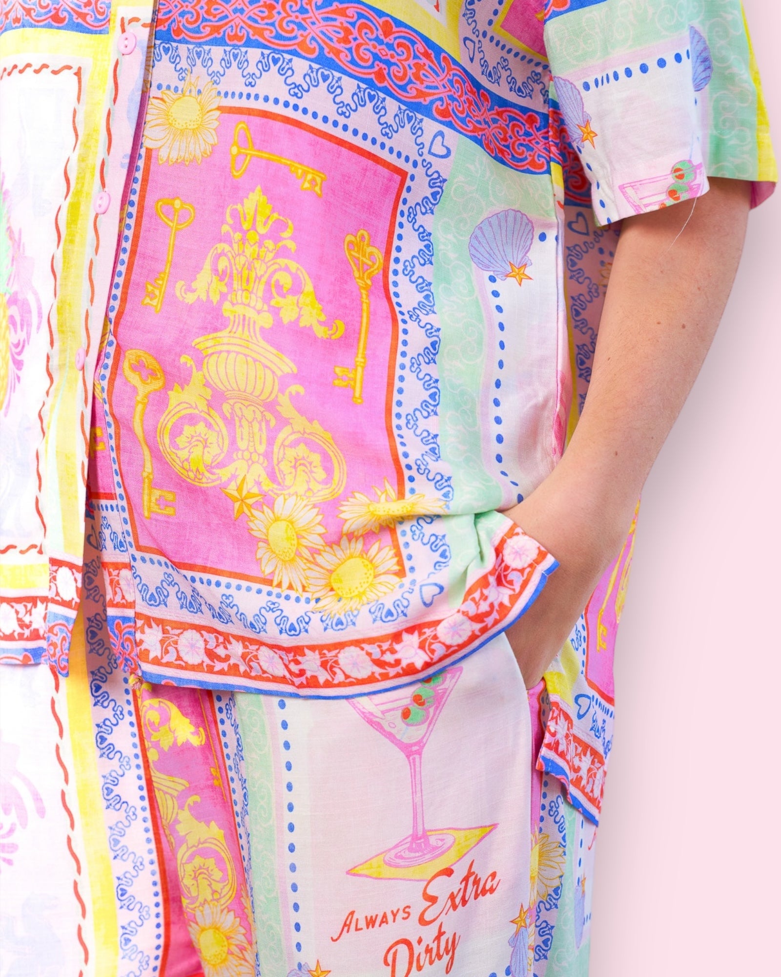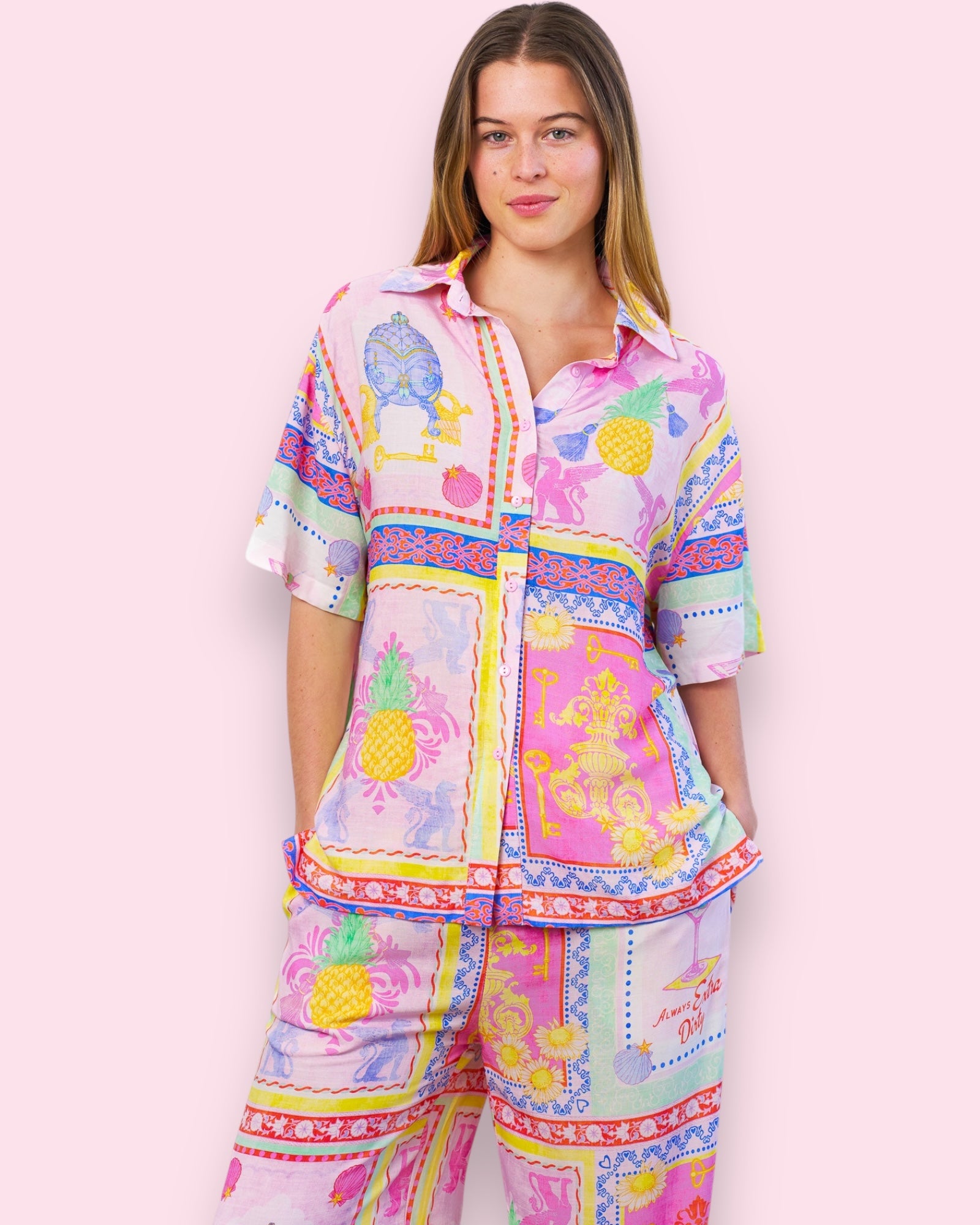 The Rhea Shirt brings a playful twist to your wardrobe with its exclusive bamboo rayon print.