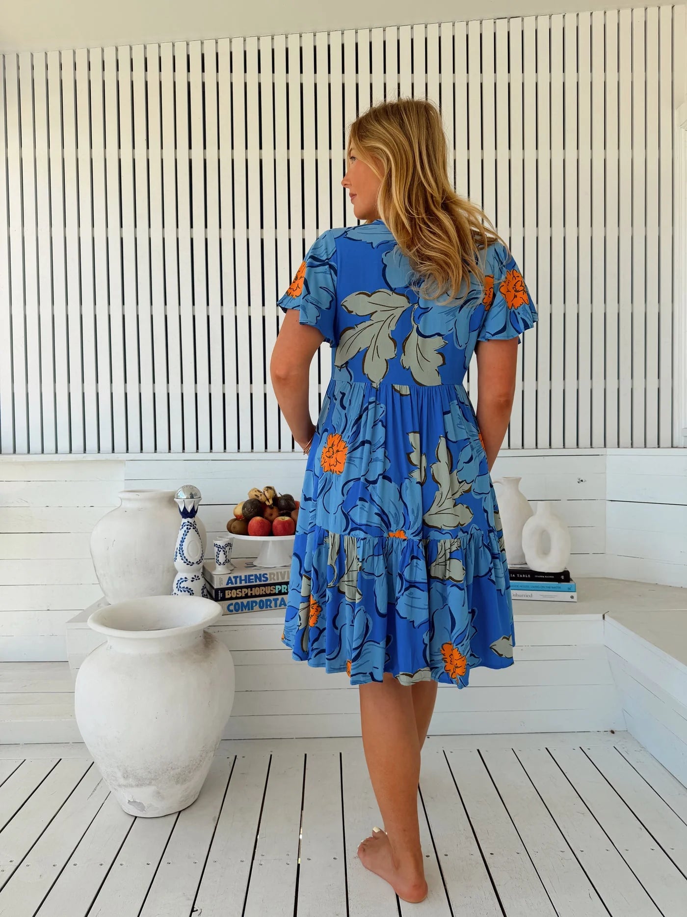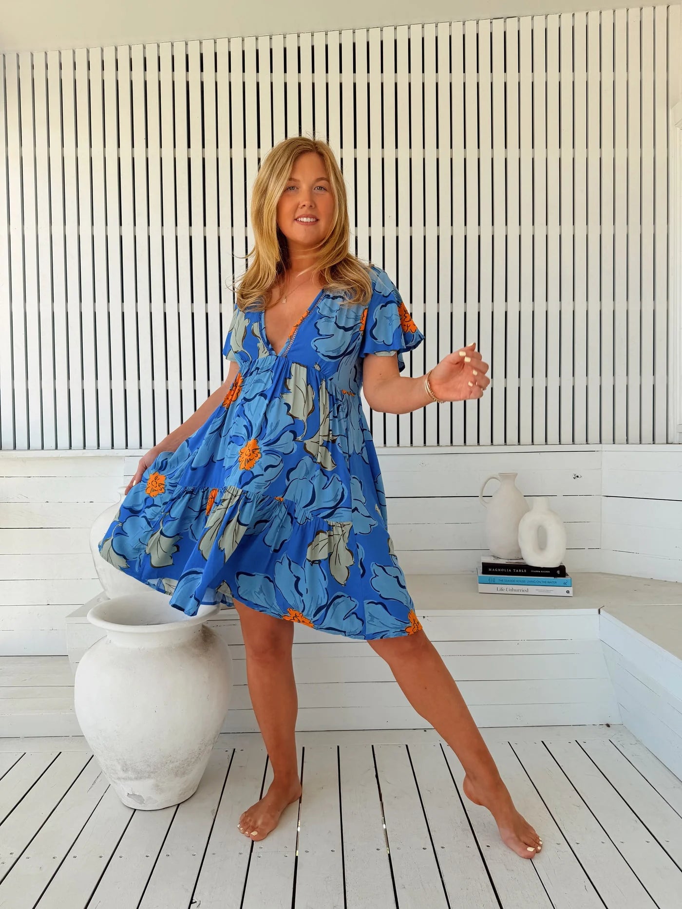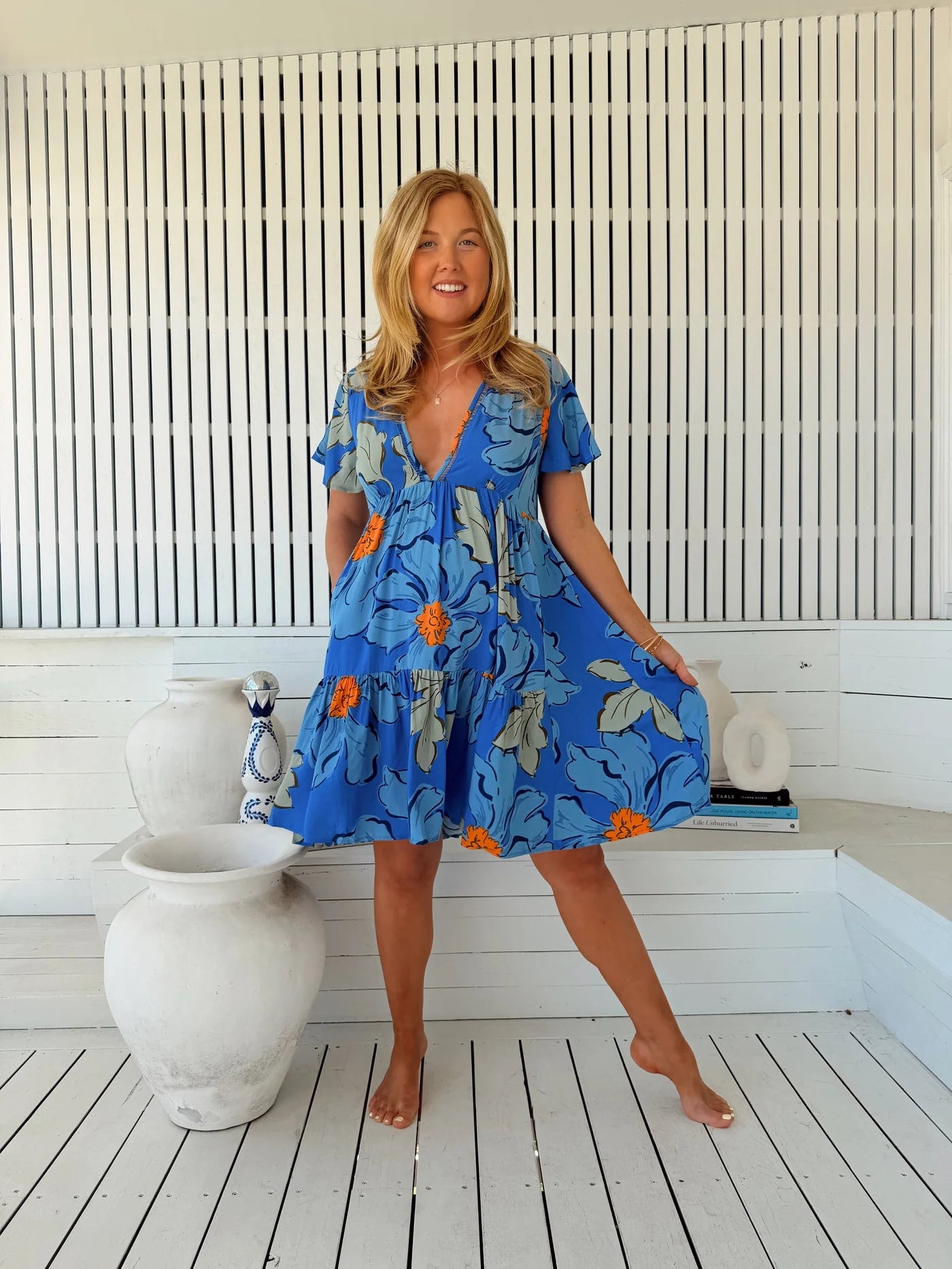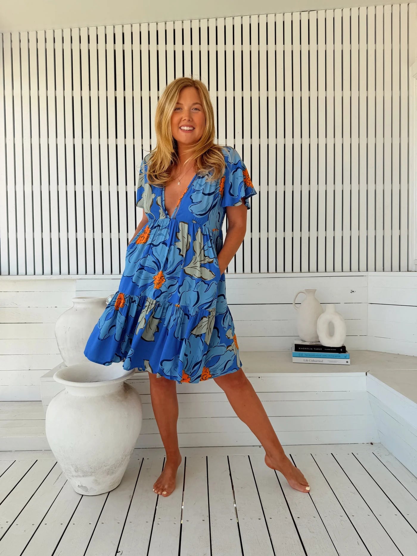 Step into playful charm with the Rhys Mini Dress in Blue Bell Print. This feminine piece features a flattering V-neckline enhanced by delicate crochet inserts along the neck and shoulders.