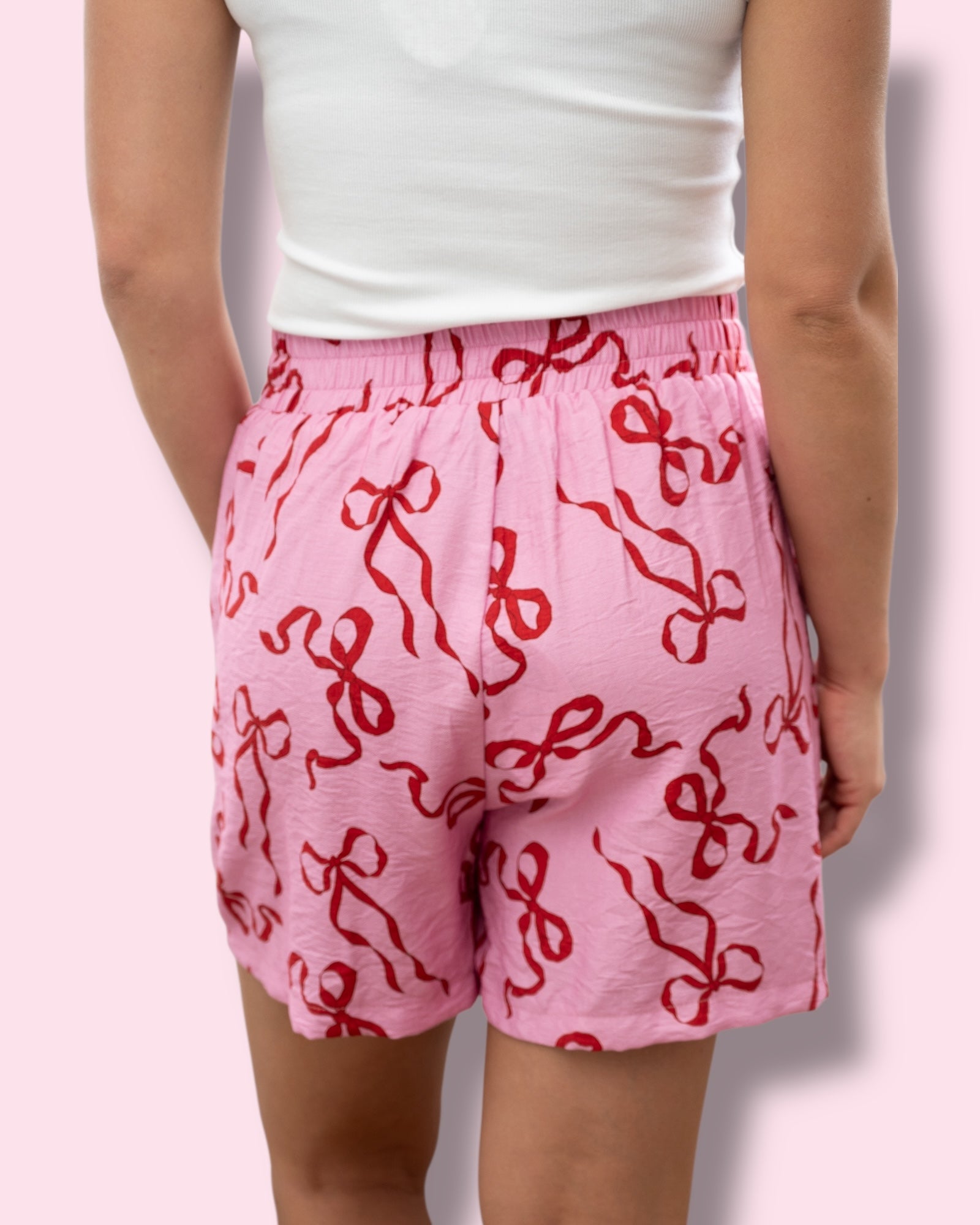 Twirl into fun with these adorable Ribbon Print Shorts! Featuring a charming bow and ribbon design in vibrant red and pink, they're perfect for adding a pop of personality to your wardrobe.