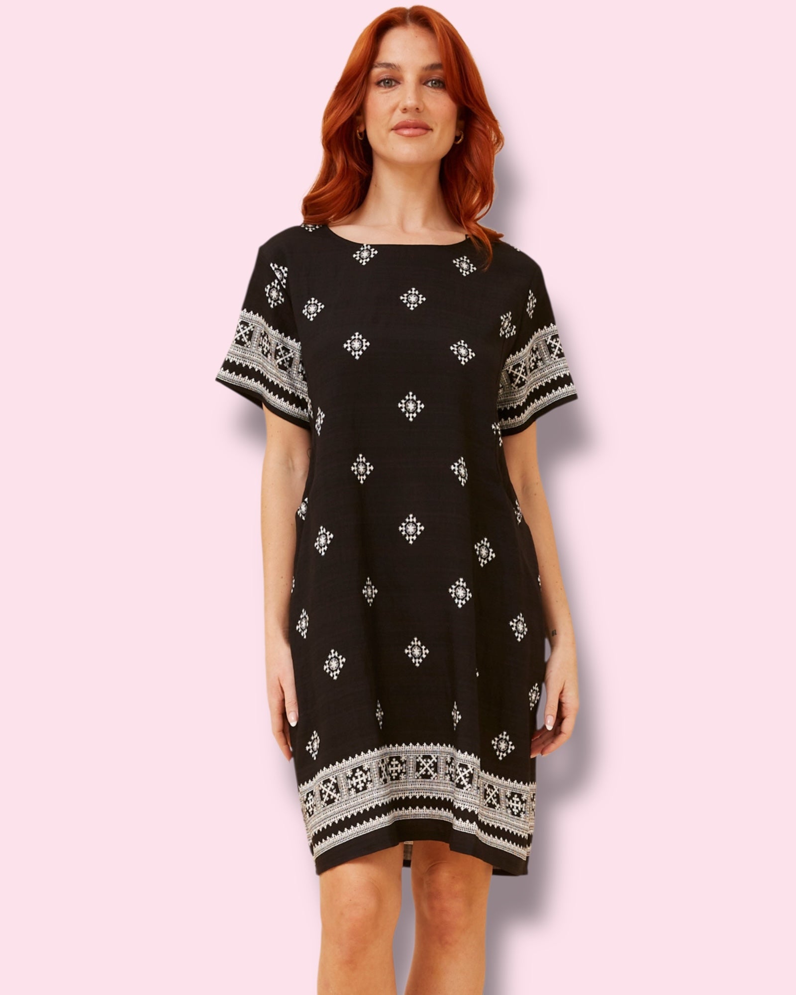 Effortlessly chic and ready for anything, the Selena Shift Dress brings relaxed elegance to your everyday rotation. This generous-fit style features a charming border print with mimic embroidery detail, rounded neckline, and short sleeves for comfortable all-day wear.