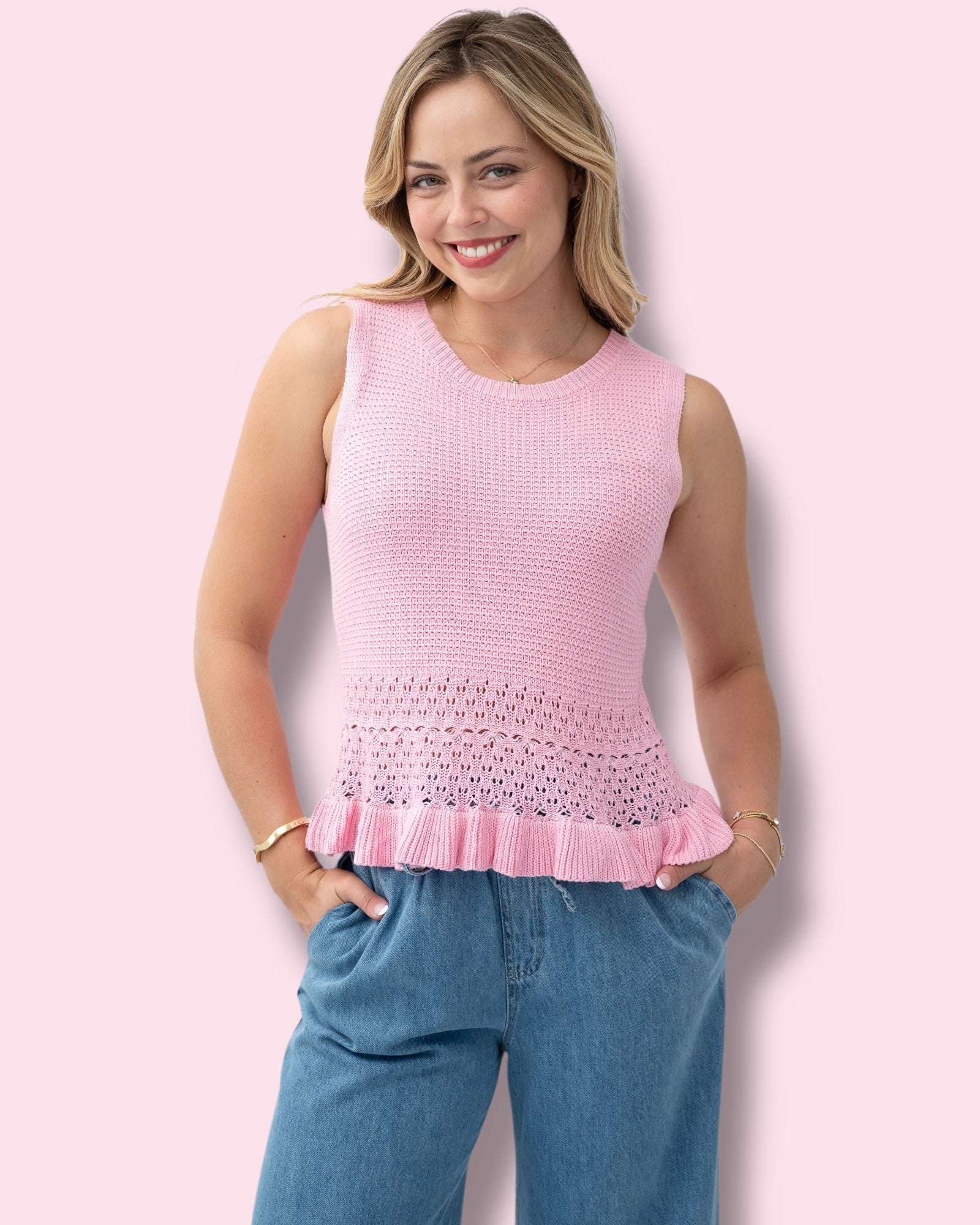 Embrace feminine charm with the Suzanne Sleeveless Knit, featuring a flirty frill hem and classic crew neck.